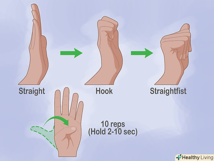 - Тримайте долоню перед собою і розпряміть пальці, як ніби ви просите когось зупинитися. Зігніть пальці гаком, затримайтеся на 5-10 секунд, а потім випрямити їх. Далі стисніть долоню в кулак, затримайтеся на 5-10 секунд і розтисніть долоню. Тепер знову стисніть долоню в кулак, але з повністю розпрямленими пальцями. Затримайтеся на 5-10 секунд і поверніть долоню у вихідне положення. Це буде одне коло з трьох вправ. Зробіть 10 кіл для обох рук.