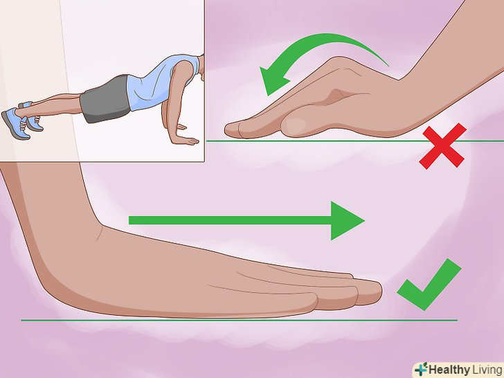 Слідкуйте за положенням рук.при занадто вузькій або занадто широкій постановці долонь зап'ястя можуть відчувати додатковий тиск. Розведення в сторони або зведення всередину долонь створює неприродне положення рук, що може додавати зайве навантаження.[3]- Прийнявши упор лежачи, перевірте положення ваших долонь. Вони повинні бути спрямовані вперед і лежати на підлозі всією площиною, включаючи пальці.