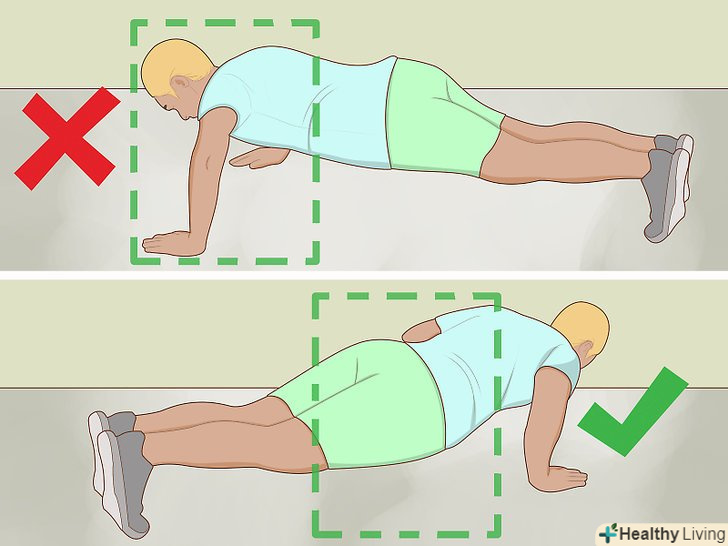 Задійте м'язи корпусу.під час віджимань повинні працювати не тільки м'язи верхньої частини тіла. Якщо виконувати віджимання, задіявши тільки верх, зап'ястя будуть відчувати надмірний тиск, що в подальшому стане причиною болю в суглобах.[5]- Якщо тіло не утворює рівну лінію під час віджимань (провисають стегна або верхня частина тіла піднімається окремо від таза), це означає, що м'язи корпусу задіяні слабо.