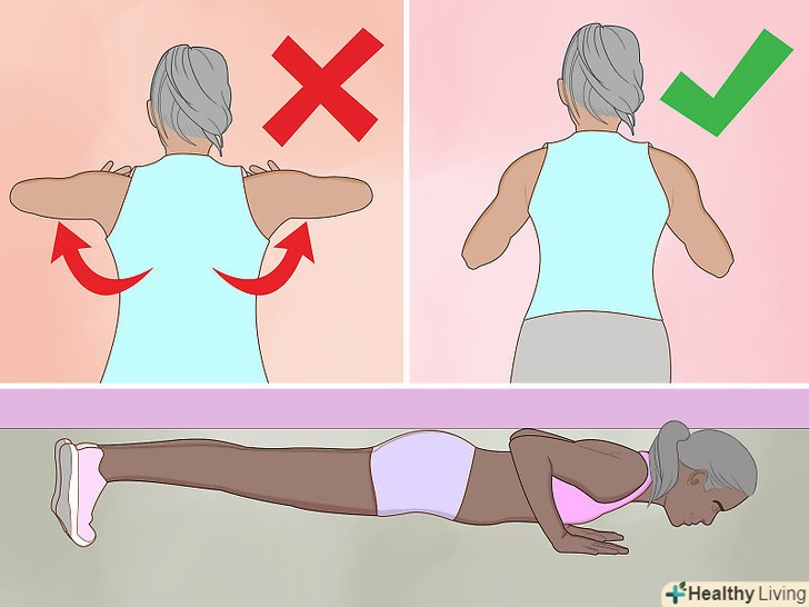 Не розводьте лікті.новачки часто виконують віджимання, розводячи лікті в сторони, замість того, щоб тримати їх ближче до тулуба.[4]- З широко розведеними ліктями віджимання виконувати, звичайно, легше (тому новачки цим часто грішать), але така постановка рук надає посилений тиск на зап'ястя. Також в подальшому можуть виникнути травми ліктьового і плечового суглоба.