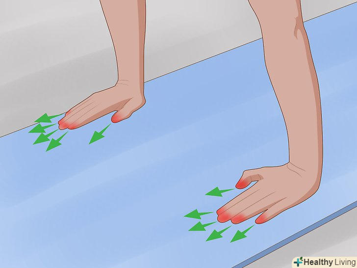 Виконуйте підйоми пальців і долонь від підлоги.ця вправа сприяє розвитку м'язів кистей рук, зап'ясть і передпліч. Крім того, його можна використовувати в якості розминки перед віджиманнями.[10]- Щоб виконати підйоми пальців, покладіть подушечки пальців на підлогу, підніміть долоні і починайте натискати вгору-вниз. Вправу можна виконувати сидячи або стоячи на колінах, але ні в якому разі не в упорі лежачи. Відчуйте, як розтягуються і розслабляються згиначі пальців. Виконуйте натискання плавно. Зробіть 12 повторень.