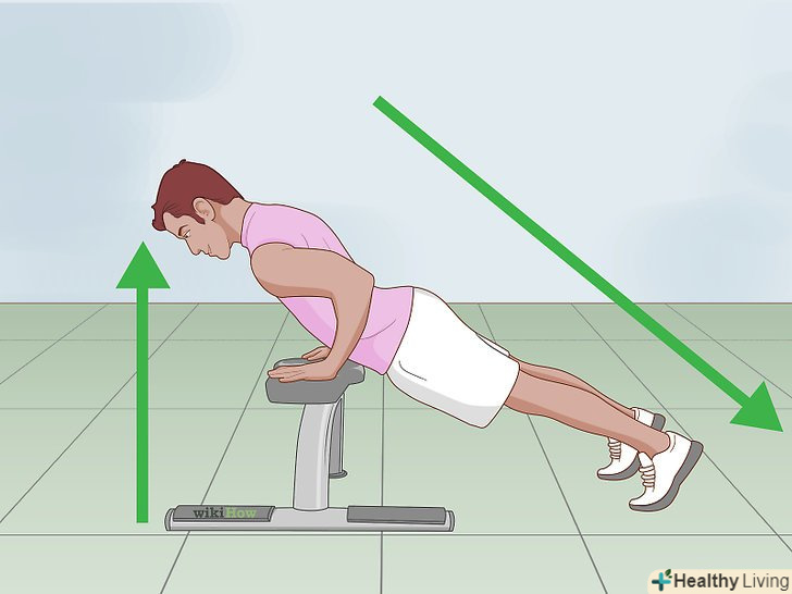 Підніміть верхню частину тіла.зміна висоти постановки рук може зменшити біль в зап'ястях при віджиманнях і стійці в планці. Підйом верхньої частини тіла природним чином знижує тиск на кисті рук і зап'ястя.[8]- Наприклад, можна покласти руки на лаву або сходинку. Рухи залишаються такими ж, як при звичайних віджиманнях.