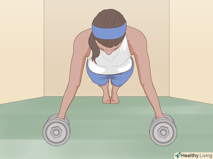 Використовуйте гантелі.при віджиманнях від гантелей зап'ястя зберігають пряме положення, що знижує тиск на них. Розмір і вага снарядів не має значення, так як вони будуть упиратися в підлогу. Головне-підібрати гантелі з грифом потрібної товщини, щоб ви могли зручно схопити їх. Крім того, вони повинні бути досить важкими, щоб не укочуватися під час виконання вправи.[9]- Поставте гантелі на рівні плечей. Обхопіть рукоятки гантелей так, щоб долоні дивилися один на одного, і прийміть упор лежачи.