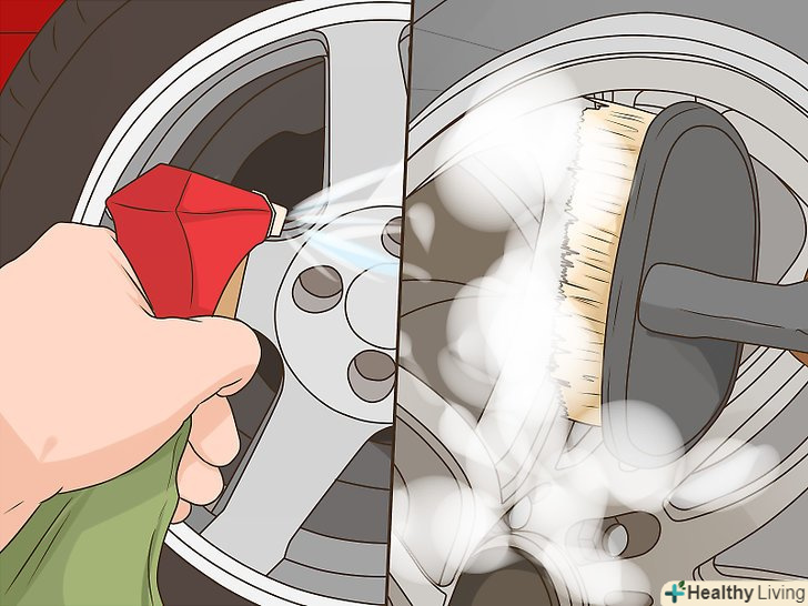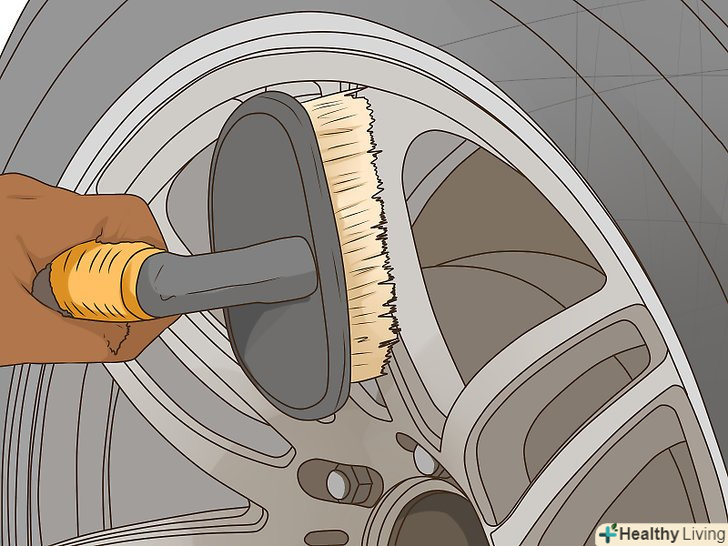 Видаліть гальмівний пил щіткою для колісних дисків. Гальмівну пил досить важко прибрати з коліс. Після того, як миючий засіб зробить свою справу, візьміть щітку для колісних дисків і видаліть всю бруд, яка прилипла до дисків.[7]- Не протирайте колеса щіткою для чищення шин. Щетинки на цих щітках занадто жорсткі і можуть подряпати шар фінішного покриття.