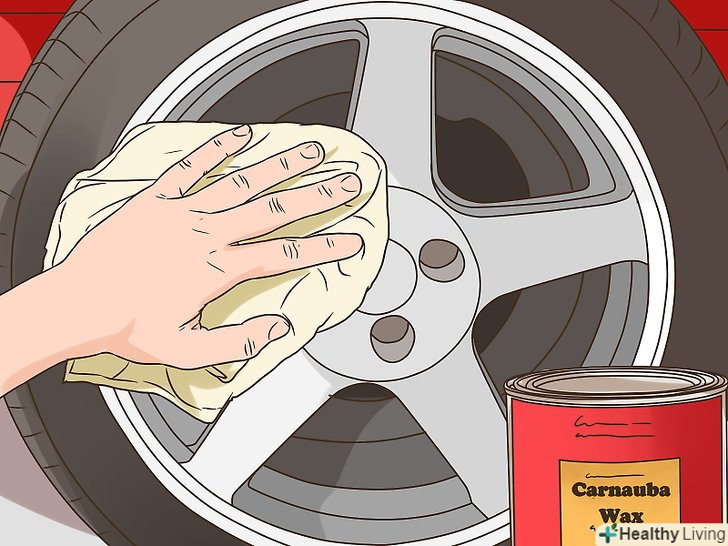 Нанесіть на диски карнаубський віск.Дайте очищеним колесам повністю висохнути. Потім нанесіть на диски тонкий шар карнаубського воску. Коли віск висохне, відполіруйте колеса тканиною із замші і видаліть з них зайвий віск, після чого вони знову будуть блищати, як і фарба на кузові авто.[12]- Завдяки воску вам буде набагато легше прибрати бруд і гальмівний пил, коли ви наступного разу будете мити диски.
