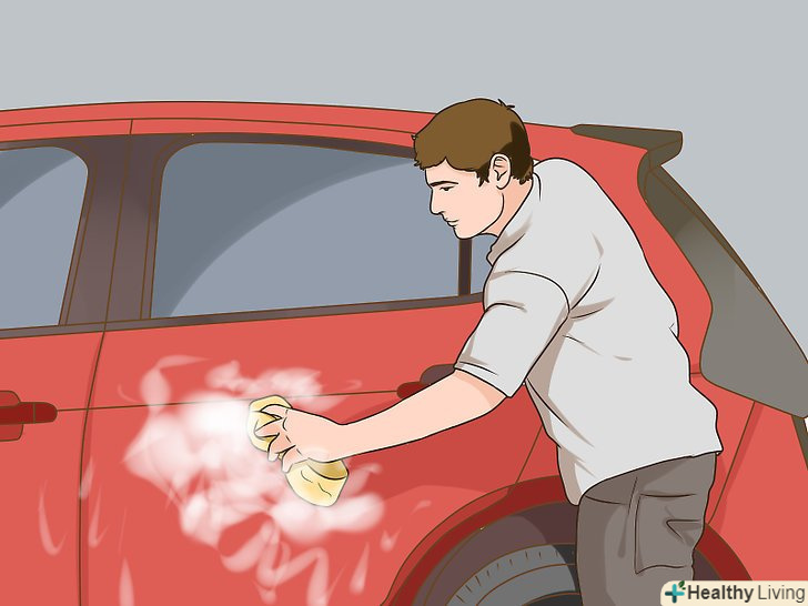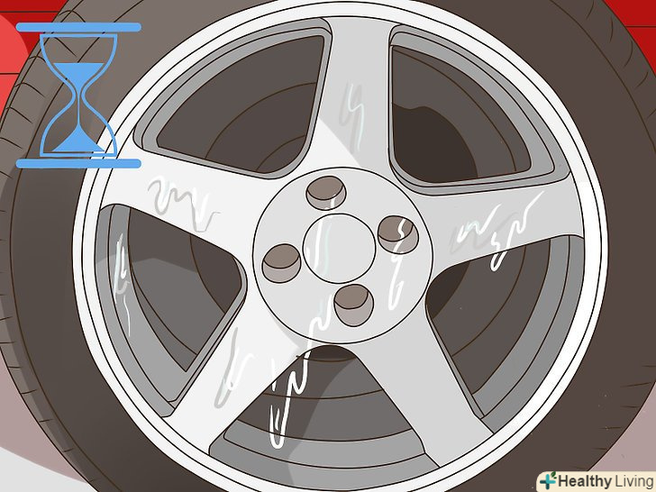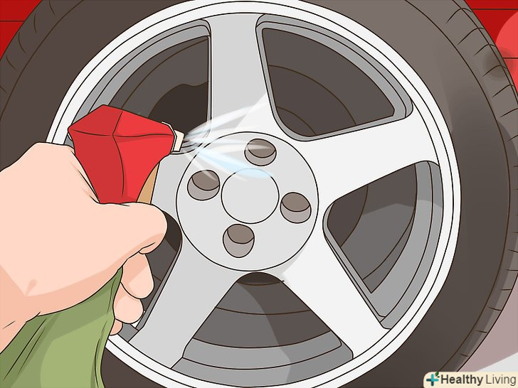 Помийте автомобіль.очисники для колісних дисків містять сильні чистячі засоби, які можуть видалити восковий або прозорий шар з фарби на кузові авто. Хоча після очищення дисків мити машину не обов'язково, краще все ж переконатися, що на фарбі не залишиться ні краплі очищувача.[9]- Якщо у вас немає часу мити автомобіль, промийте нішу коліс шасі водою зі шланга.