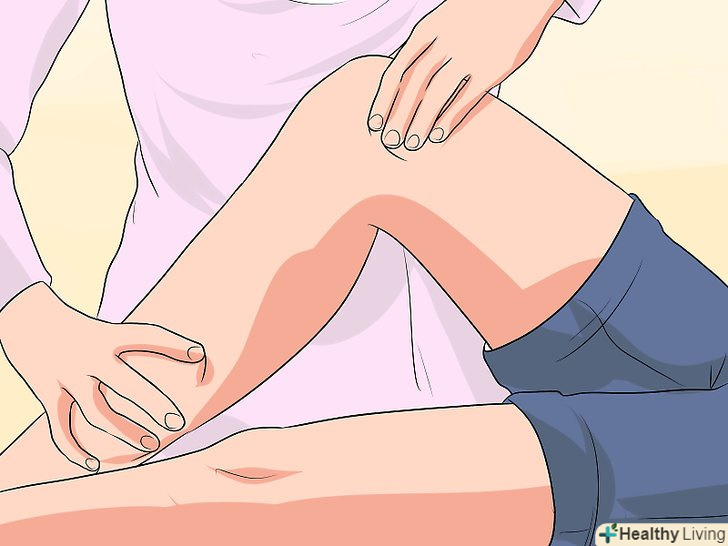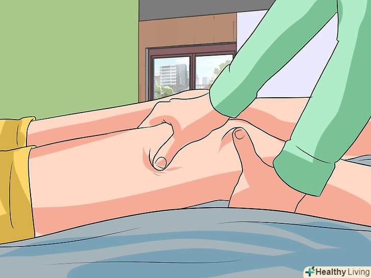 Зробіть глибокий масаж тканин.під час операції з ендопротезування колінного суглоба розрізають м'язи, що оточують суглоб, для того щоб очистити і обробити поверхню кісток. В результаті після операції відбувається запалення і спазм м'язів. Через кілька тижнів після операції можна зробити глибокий масаж тканин, щоб розслабити м'язи, зменшити спазм і боротися із запаленням.[15] почніть з 30 хвилинного масажу м'язів передньої і задньої поверхні стегна. Дозвольте лікарю масажувати настільки глибоко, наскільки ви зможете витерпіти. Зробіть глибокий масаж тканин.під час операції з ендопротезування колінного суглоба розрізають м'язи, що оточують суглоб, для того щоб очистити і обробити поверхню кісток. В результаті після операції відбувається запалення і спазм м'язів. Через кілька тижнів після операції можна зробити глибокий масаж тканин, щоб розслабити м'язи, зменшити спазм і боротися із запаленням.[15] почніть з 30 хвилинного масажу м'язів передньої і задньої поверхні стегна. Дозвольте лікарю масажувати настільки глибоко, наскільки ви зможете витерпіти.- Після масажу пийте побільше води, щоб вимивати з організму побічні продукти запалення і молочну кислоту. Якщо цього не робити, то вас може турбувати головний біль або легка нудота.