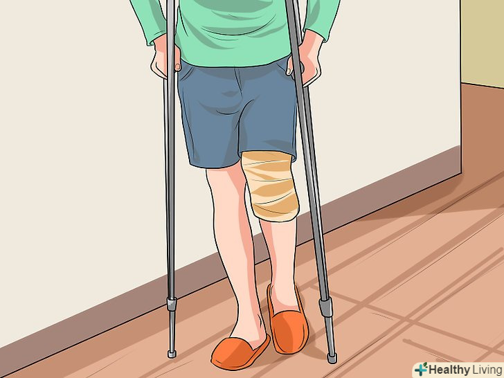 Використовуйте для пересування милиці.перші кілька тижнів після операції можна пересуватися за допомогою милиць (зазвичай їх пропонують в лікарні), щоб зменшити навантаження на проопероване коліно. У післяопераційний період важливо зберігати рухливість суглоба, проте протягом перших тижнів, поки не заживуть і не зміцніють м'язи навколо коліна, не можна спиратися на ногу всією масою тіла. Використовуйте для пересування милиці.перші кілька тижнів після операції можна пересуватися за допомогою милиць (зазвичай їх пропонують в лікарні), щоб зменшити навантаження на проопероване коліно. У післяопераційний період важливо зберігати рухливість суглоба, проте протягом перших тижнів, поки не заживуть і не зміцніють м'язи навколо коліна, не можна спиратися на ногу всією масою тіла.- Ви зможете знову вести звичний спосіб життя (в тому числі ходити без милиць і вільно згинати коліно) через 3-6 тижнів після операції.[6]