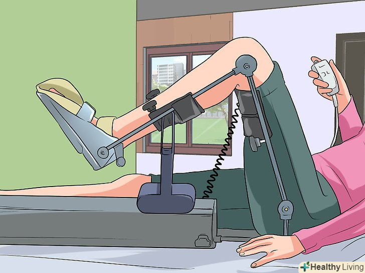 Використовуйте апарат для безперервного пасивного руху.це пристрій, який прискорює процес відновлення і зменшує ригідність прооперованого коліна, за допомогою його тривалої пасивної розробки (CPM-апарат).[12] СРМ-апарат кріпиться до прооперованої ноги і автоматично розробляє колінний суглоб за допомогою різних рухів протягом певного часу, поки пацієнт відпочиває. Такі пасивні вправи сприяють поліпшенню кровообігу, а також зменшують ймовірність утворення рубців і контрактур м'яких тканин, що оточують коліно. Використовуйте апарат для безперервного пасивного руху.це пристрій, який прискорює процес відновлення і зменшує ригідність прооперованого коліна, за допомогою його тривалої пасивної розробки (CPM-апарат).[12] СРМ-апарат кріпиться до прооперованої ноги і автоматично розробляє колінний суглоб за допомогою різних рухів протягом певного часу, поки пацієнт відпочиває. Такі пасивні вправи сприяють поліпшенню кровообігу, а також зменшують ймовірність утворення рубців і контрактур м'яких тканин, що оточують коліно.- СРМ-апарат також допомагає запобігти утворенню тромбів в ногах.