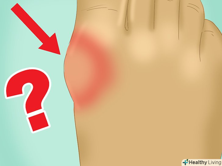 Зверніть увагу на симптоми подагри.не дивуйтеся, якщо симптоми виникнуть раптово. Зазвичай симптоми подагри виникають вночі. Як правило, симптоми найболючіші в перші 4-12 годин після першого нападу. До симптомів подагри відносяться:[15]- Сильний біль в суглобах: в ступнях (найбільш часто ‒ біля основи великого пальця), щиколотках, колінах або зап'ястях.