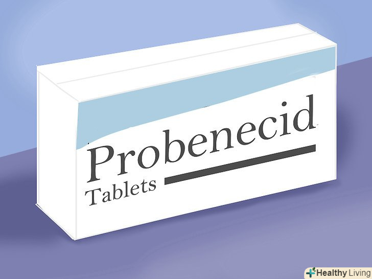 Приймайте пробенецид.вам також можуть виписати пробенецид, який збільшує виведення сечової кислоти і зменшує ускладнення, викликані подагрою. Ці ліки допоможуть ниркам вивести сечову кислоту з організму, але тоді у вашій сечі буде більше сечової кислоти. Це може стати причиною виникнення інших проблем зі здоров'ям, на зразок каменів в нирках, болів в животі або висипу. Обов'язково дотримуйтеся вказівок лікаря щодо дозування препаратів.[5]- До побічних ефектів від прийому пробенециду можна віднести головні болі, біль в суглобах і прискорене дихання.[6]