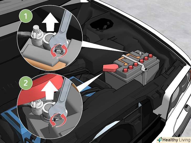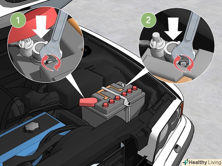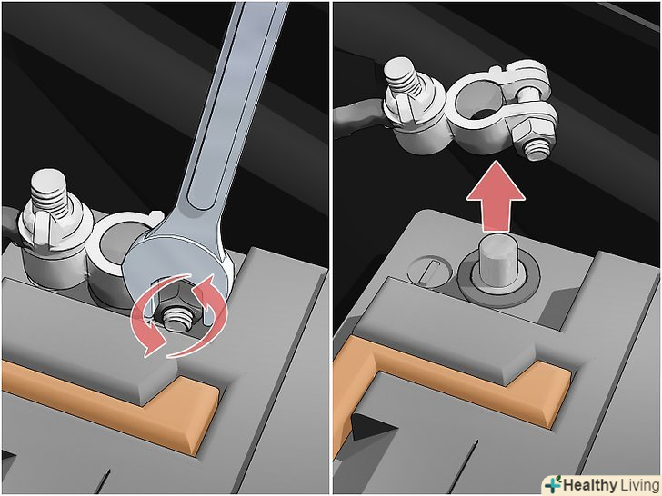Відпустіть гайку на негативній ( - ) клемі проводки.зніміть клему з виводу акумулятора.- Зробіть те ж саме і з позитивною (+) клемою. Якщо клеми погано піддаються, то під час зняття спробуйте покачати їх з боку в бік.