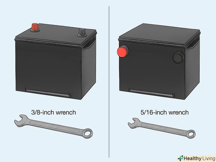 Розберіться в розташуванні висновків акумулятора.існує два варіанти.- Якщо висновки знаходяться з боків батареї, то для відкручування клем проводки вам буде потрібно ключ на 8.