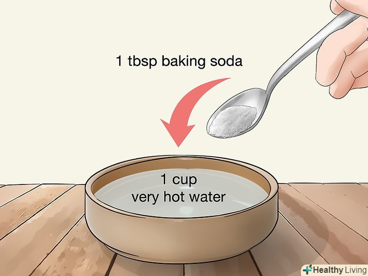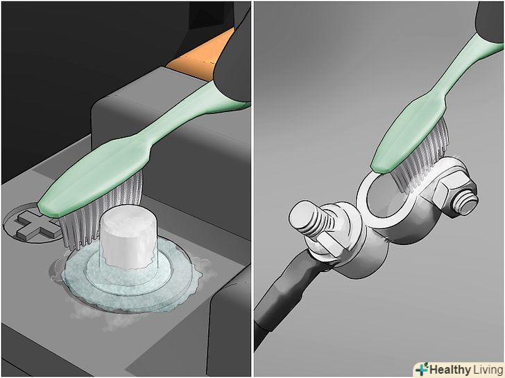 Розчиніть 1 столову ложку (28-30 г) соди в 1 склянці (250 мл) води.намочіть в отриманій субстанції стару зубну щітку і потріть верхню частину клеми, щоб видалити шар корозійних відкладень.- Ви навіть можете опустити кінці кабелів батареї в гарячу воду для розчинення корозії на кінцях кабелів.
