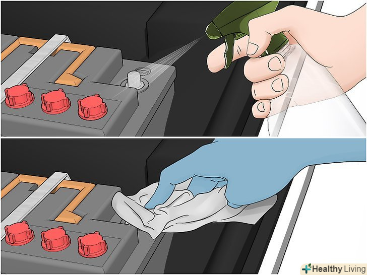 Обмийте акумулятор і клеми проводки холодною водою.продовжуйте, поки повністю не змиєте залишки соди і корозійного нальоту. Чистою ганчіркою витріть клеми насухо.
