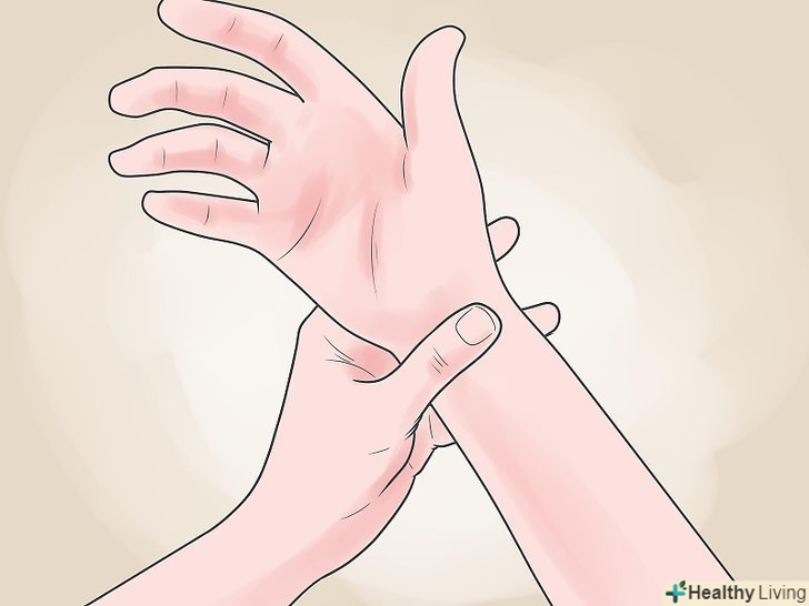 Згинайте зап'ястя.у більшості випадків артрит впливає не тільки на пальці, але і на зап'ясті. Тому ваші тренування повинні включати також вправи для зап'ястя.- Опустіть ліву руку долонею вниз, тримаючи лікоть прямо, пальці спрямовані вперед. Покладіть праву руку на тильну сторону лівої руки.