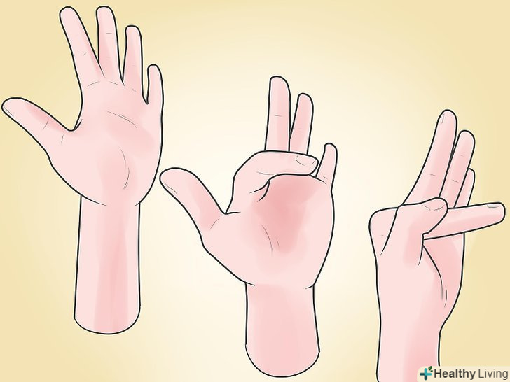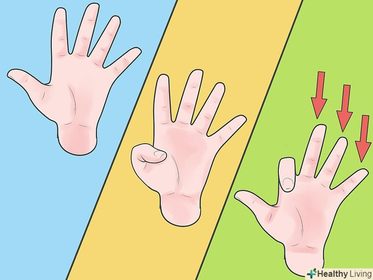 Згинайте великий палець.ця вправа спрямована на розминання пальців і ослаблення жорсткості і в той же час на зміцнення великого пальця.- Почніть з відкриття і випрямлення всіх пальців. Зігніть вказівний палець до долоні.