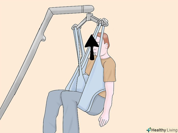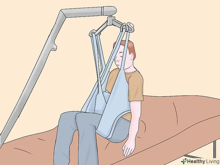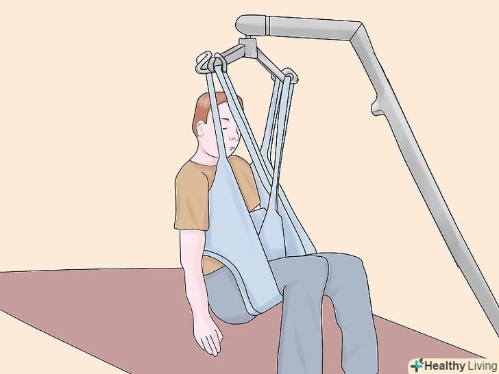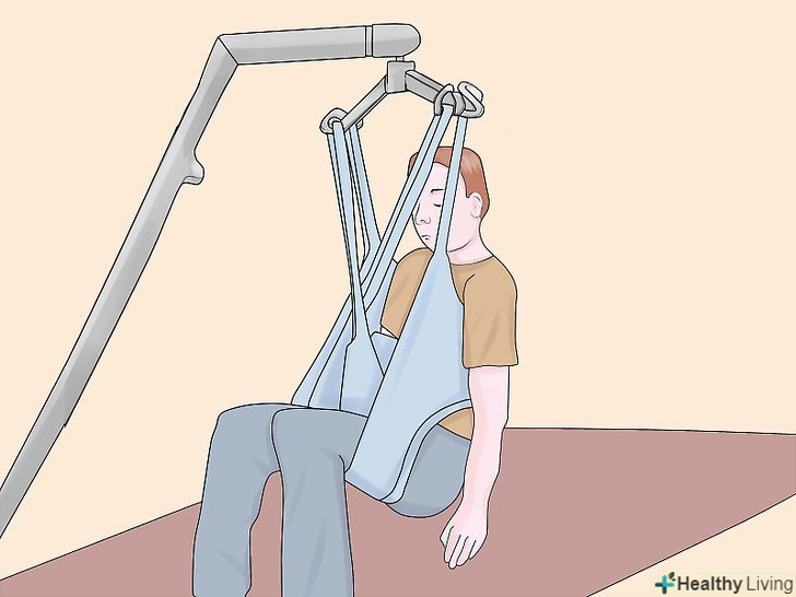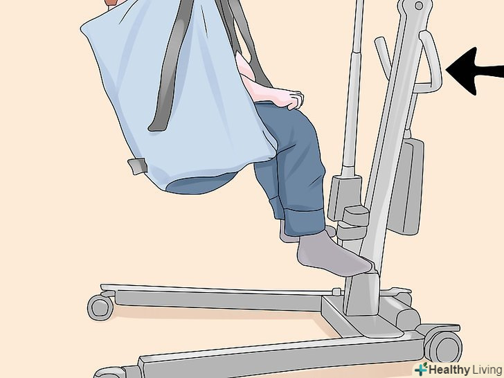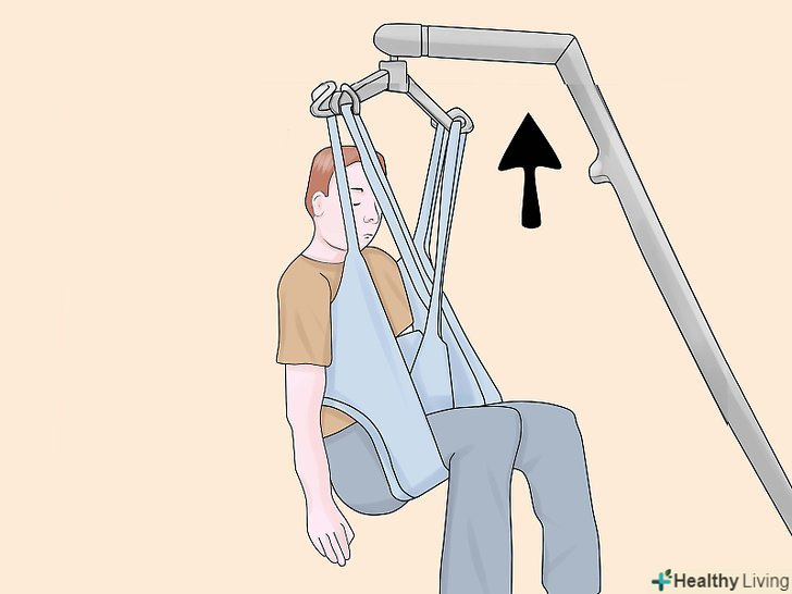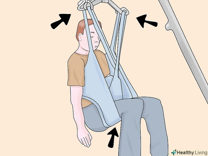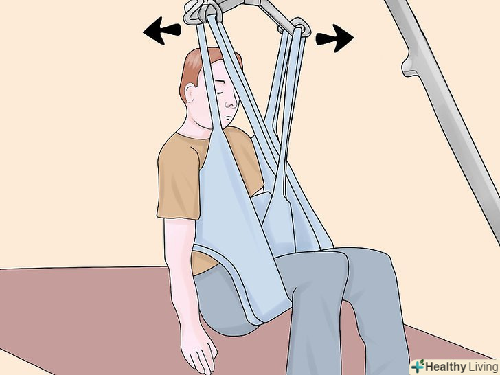 Підчепіть петлі стропи до важеля.позаду плечей пацієнта, на стропі, є регульовані петлі, Ви можете вибрати найбільш підходящий варіант і підчепити їх до гаків ближнім до опори підйомника.- Схрестіть петлі для ніг під ногами пацієнта. Переконайтеся, що ліва петля може дотягнутися до правого гака, а права петля до лівого, також переконайтеся, що петлі для ніг закріплені до гаків розташованим далі від опори підйомника. Цей Перехрест петель, допомагає пацієнтові тримати ноги разом і не дає йому вислизнути з стропи.