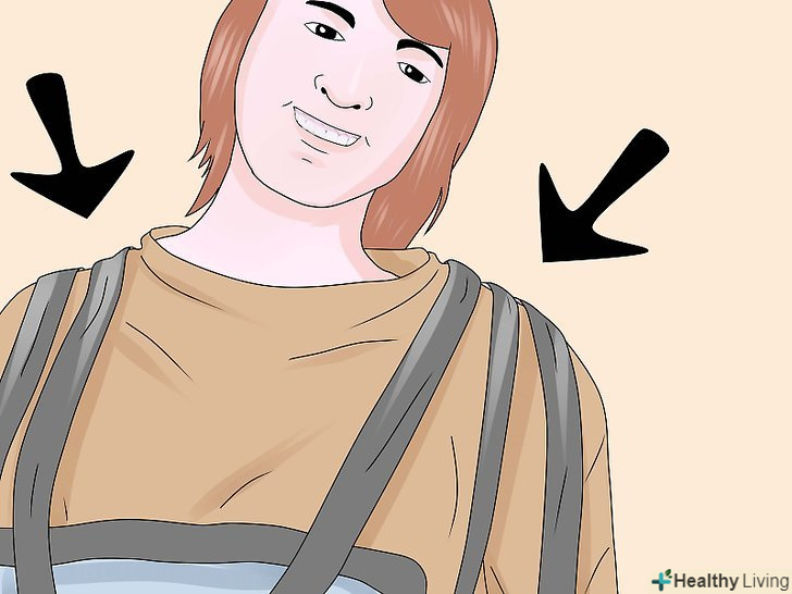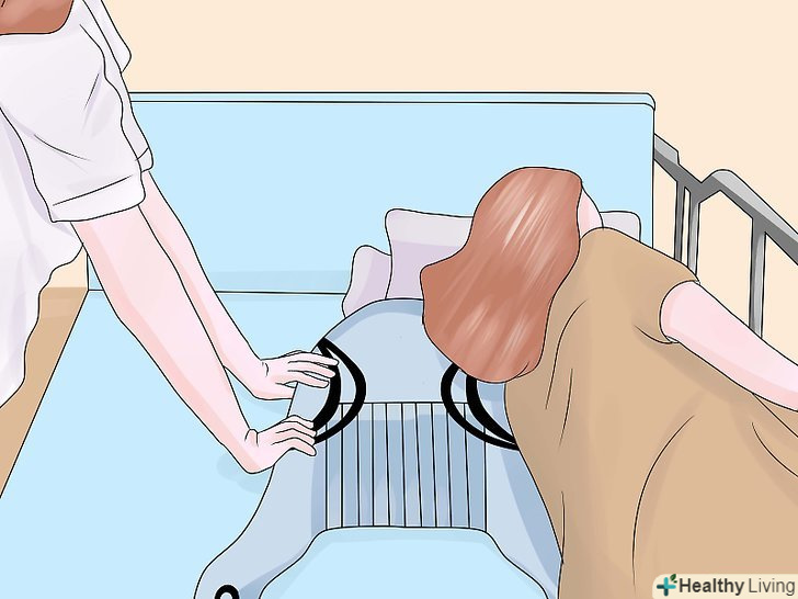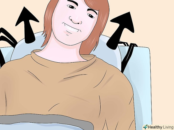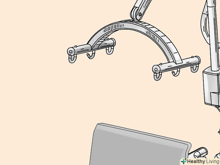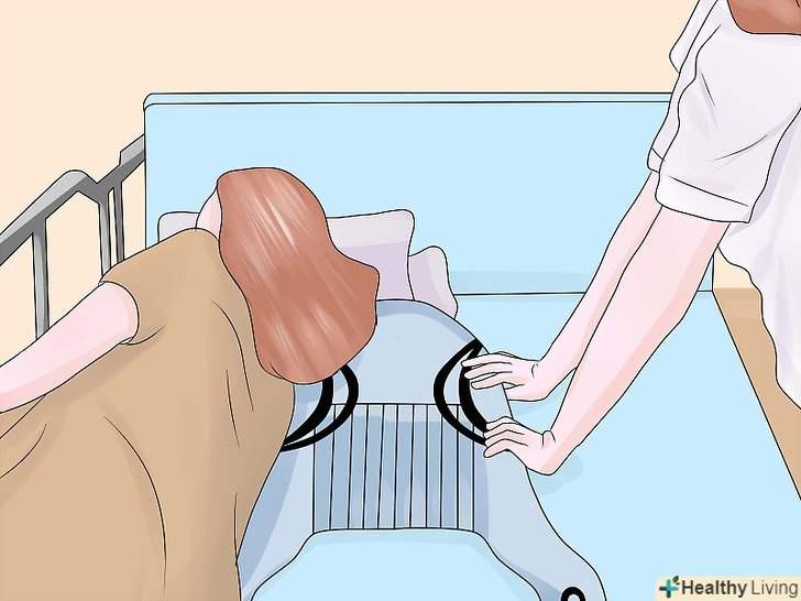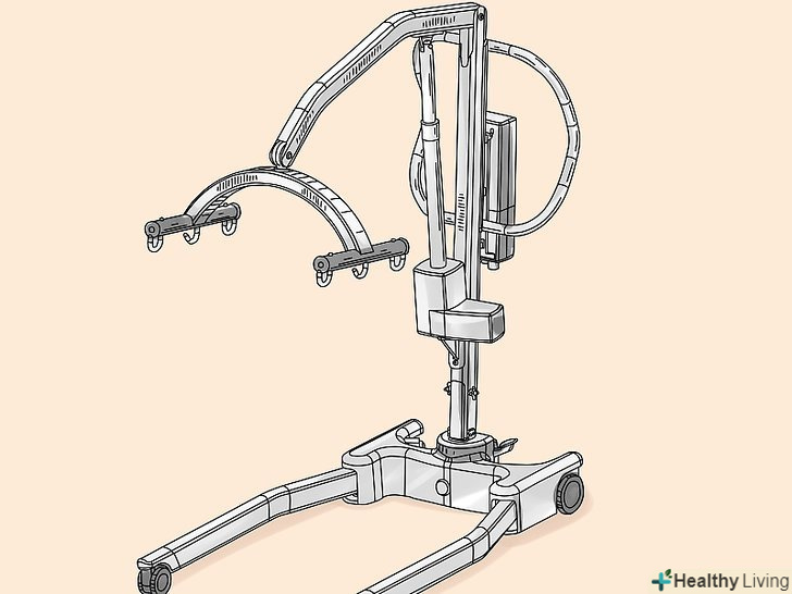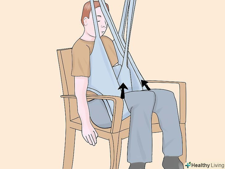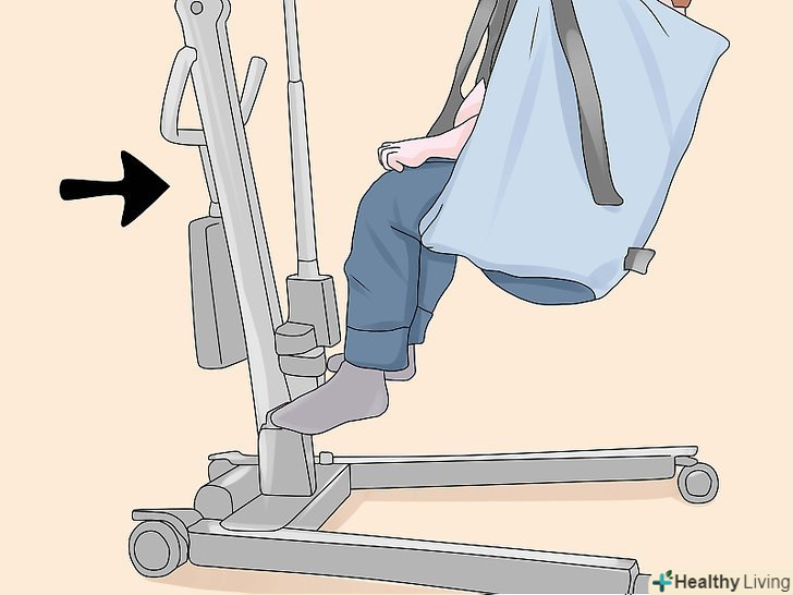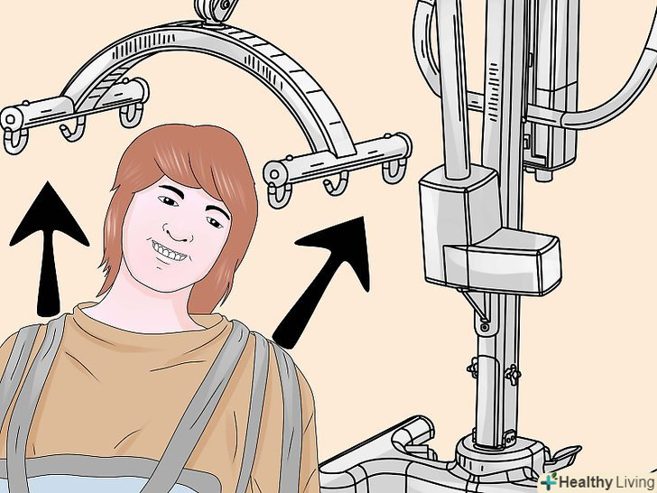 Підчепіть петлі стропи до важеля.позаду плечей пацієнта, на стропі, є регульовані петлі, Ви можете вибрати найбільш підходящий варіант і підчепити їх до гаків ближнім до опори підйомника.- Схрестіть петлі для ніг під ногами пацієнта. Переконайтеся, що ліва петля може дотягнутися до правого гака, а права петля до лівого, також переконайтеся, що петлі для ніг закріплені до гаків розташованим далі від опори підйомника. Цей Перехрест петель, допомагає пацієнтові тримати ноги разом і не дає йому вислизнути з стропи.