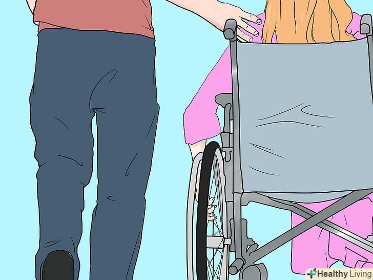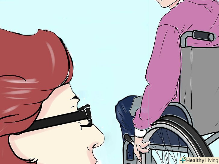Запропонуйте допомогу, коли це доречно.дуже складно дізнатися, коли доречно запропонувати руку допомоги. Пам'ятайте, що навіть якщо людина користується інвалідним кріслом, це не обов'язково може означати, що він потребує допомоги. Як правило, такі люди вважають за краще залишатися незалежними від інших і пишаються тим, що в достатній мірі навчилися пристосовуватися до існуючих умов. Якщо складається така ситуація, де може знадобитися ваша допомога, уточніть. Що б ви не робили, не торкайтеся інвалідного крісла без дозволу. Навіть якщо в той момент вони не користуються інвалідним візком, було б краще спочатку порадитися, а тільки потім відсунути її в інше, важкодоступне для них місце.- Будьте готові почути "ні". Оскільки велика ймовірність, що в минулому багато інваліди-візочники відчували поблажливе ставлення з боку незнайомих людей, деякі з них здадуться вам непривітними або грубими, коли ви запропонуєте їм допомогу. Якщо на вашу пропозицію допомогти ви почули грубий, уїдливий відповідь, не варто утримуватися від надання допомоги, коли ви наступного разу зустрінете таку людину. Не залишайте без уваги людину, яка намагається з усіх сил обійтися без сторонньої допомоги. Деякі інваліди-візочники можуть прийняти допомогу при будь-якому зручному випадку, але не більше. Наприклад, вам можуть відмовити, якщо ви запропонуєте допомогти прокатати крісло уздовж пандуса в гарну погоду, але ця ж пропозиція може бути прийнята, коли на вулиці занадто жарко.