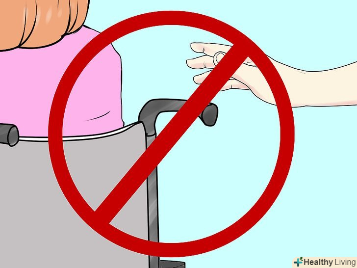 Не плескайте і не торкайтеся до самої людини (або його інвалідного крісла) до тих пір, поки вам не дозволять.оскільки в інвалідному кріслі вони ростуть з дитини, люди інтуїтивно намагаються поплескати їх по плечу або доторкнутися до них; для людей з проблемами спини або хребта це може заподіяти біль, крім того, такий жест може здатися поблажливим. Те ж саме відноситься до того випадку, коли ви спираєтеся або торкаєтеся до інвалідного крісла.