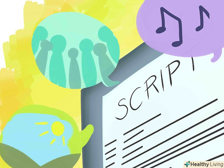 Якщо хочете, розмістіть друзів або музикантів за сценою; в цьому випадку музика буде звучати чистіше, різкіше і чіткіше.або ви могли б записати музику, яку ви склали, завантажити її в ваш комп'ютер, а потім вставити її в ваш фільм, або просто пошукайте готову музику/звуки в програмі, якою користуєтеся.
