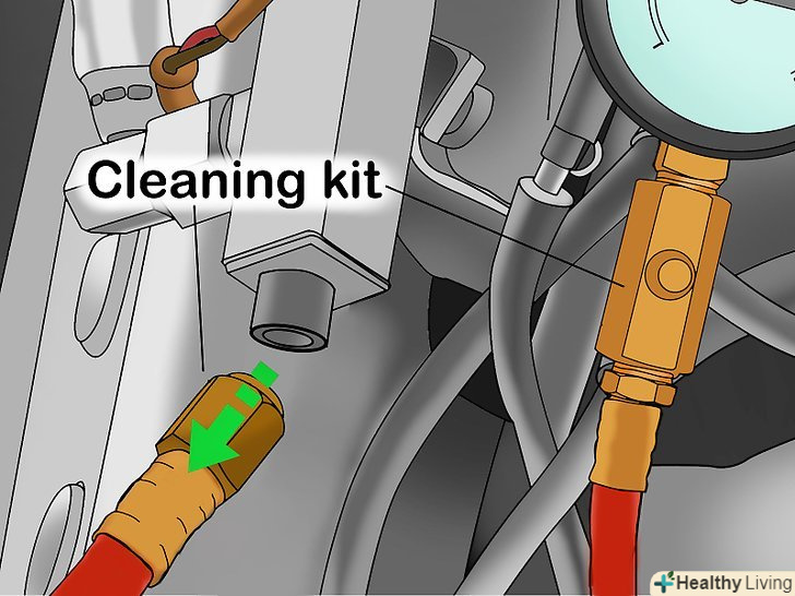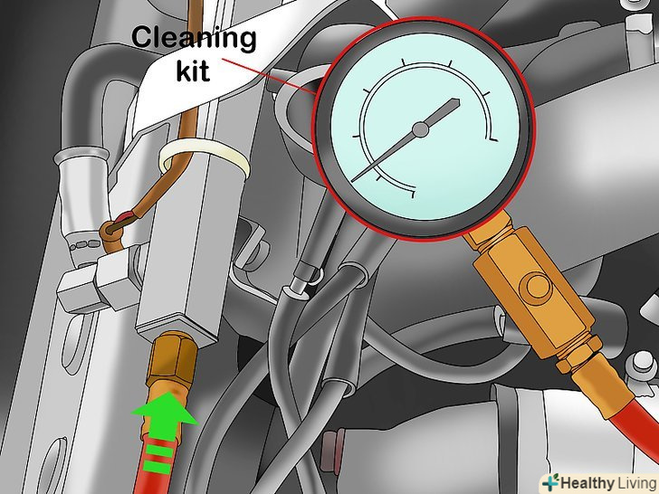 Придбайте комплект для очищення паливних форсунок.вони доступні в будь-якому автомагазині, або ж ви можете купити такий набір в Інтернеті. У цьому комплекті ви знайдете пляшку з очисною рідиною для паливних форсунок, манометр для вимірювання тиску палива і шланг, який кріпиться до Паливної форсунки.- Більшість наборів для чищення паливних форсунок можна використовувати для будь-якого типу транспортного засобу, але краще прочитайте керівництво по експлуатації, щоб переконатися, що обраний комплект підходить для роботи з вашим автомобілем.