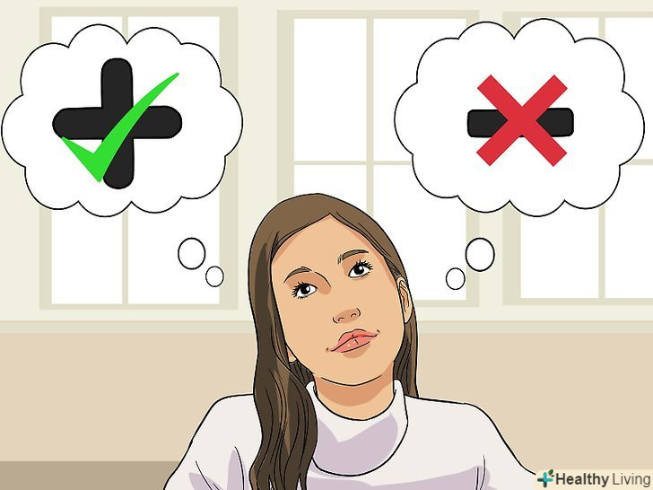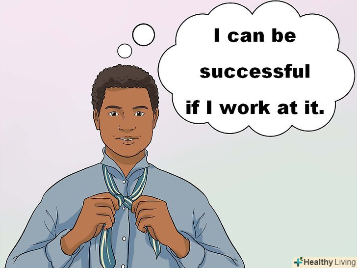 Переведіть свої думки в позитивне русло.піймавши себе на негативній думці, переінакшіть її, зробивши позитивною. Позитивні думки можуть мати форму позитивних тверджень, [5], таких як "я повинен спробувати зробити це"," я зможу досягти успіху при належних зусиллях","оточуючі прислухаються до мене". Почніть хоча б з декількох позитивних думок протягом дня.