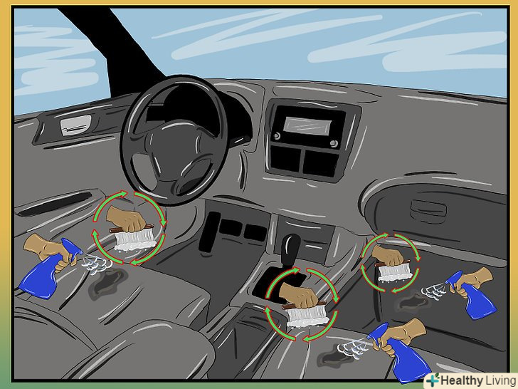 Почистіть килимове покриття в машині.розподіліть засіб для миття килимів на тканинну поверхню салону автомобіля, а потім повільно і поступово очистіть її щіткою. У разі необхідності поверніться до проблемних ділянок з плямами або великими скупченнями бруду. Розподіляйте засіб рівномірно і продовжуйте чистити до тих пір, поки не будете задоволені результатом.- Промийте килимки миючим засобом.у той час як буде тканинне покриття автомобіля, поверніться до ваших знятим килимків і помийте їх миючим засобом за допомогою щітки. Часто килимки-це одна з найбрудніших частин вашого автомобіля, тому що ви стаєте на них брудним взуттям під час їзди. Поверніть килимки в автомобіль після того, як вони висохнуть.