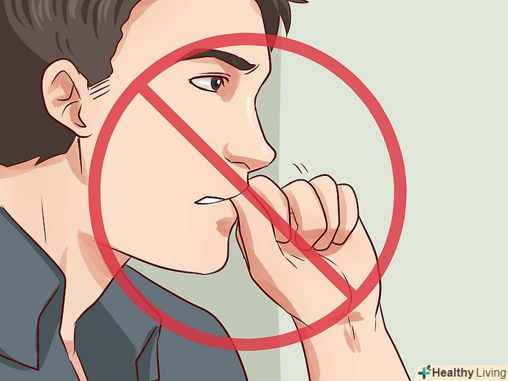 Позбавляйтеся від шкідливих звичок.[15] ви соватися або нервово рухаєте ногою, коли сидите? Спробуйте помічати або попросіть кого-небудь вказати вам на неспокійні дії і мову тіла. Почніть навмисно чинити опір таким звичкам, стежте за собою і своєчасно зупиняйтеся або клацайте гумкою по зап'ясті, коли робите такі дії. Все це дозволить вам взяти себе в руки і вплинути на реакцію оточуючих. Обидва аспекти підвищать вашу впевненість у собі в довгостроковій перспективі і допоможуть вирішити проблему.