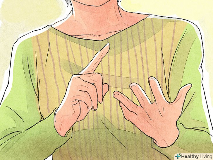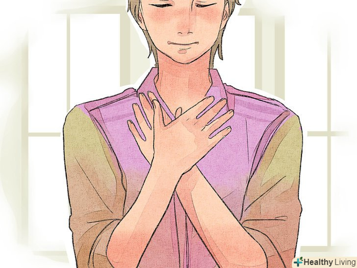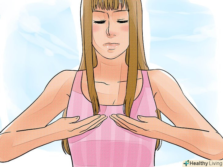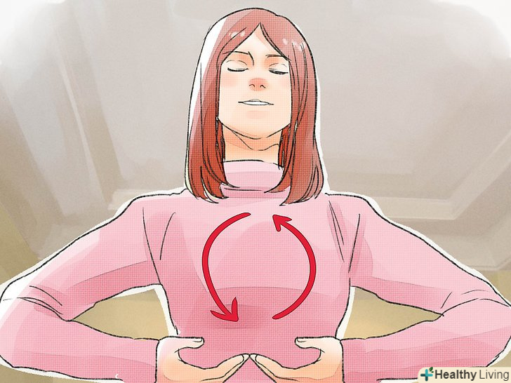 - Покладіть одну руку на груди, а іншу - на живіт. Стійте, лежите або сидите прямо, щоб груди були відкритими. Зробіть повільний і глибокий вдих (через ніс). Ви відчуєте, як груди і живіт розширяться. Потім зробіть видих (через ніс або рот). Зробіть 6-10 глибоких вдихів за хвилину.[11]