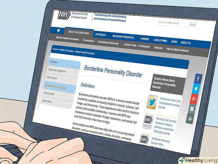 Вивчіть, що таке прикордонний розлад особистості.це захворювання таке ж реальне і руйнівне, як і фізичні захворювання. При цьому в ньому немає» провини " вашого близького. Ваш близька людина може відчувати жахливе почуття сорому і провини за свою поведінку, але бути при цьому нездатним що-небудь змінити. Розуміння природи прикордонного розладу особистості допоможе вам надати своєму близькому максимальну підтримку. Вивчіть матеріали, присвячені тому, що це за захворювання і як ви можете при цьому допомогти.[30]- Велику кількість інформації англійською мовою можна знайти на сайті американського Національного інституту психічних захворювань (The National Institute of Mental Health).[31]