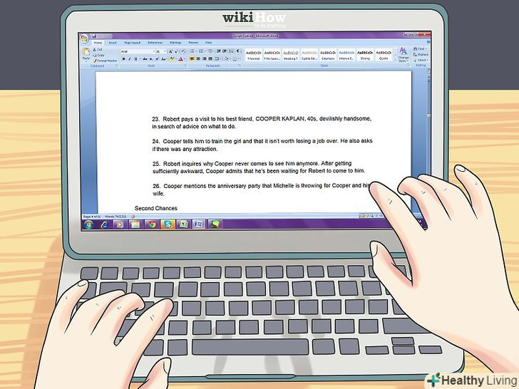 Прийшов час насичувати розповідь деталями.опишіть основну інтригу твору, але додайте багато подробиць і варіантів розвитку подій; зараз можна не думати про формат стилі тощо — дайте волю творчості. В результаті ви повинні отримати сюжет, особистості героїв, відносини, зв'язки персонажів і саму суть історії. Можна використовувати малюнки і діаграми для наочності, щоб наочно продемонструвати іншим інтригу і персонажів сценарію.- Ваші образи повинні стати двигунами подій на екрані або сцені, тому переконайтеся, що вони цікаві і нові. Не обов'язково відразу продумувати їх до деталей, але вони повинні «вжитися» в свої власні ролі, поки пишеться сценарій.