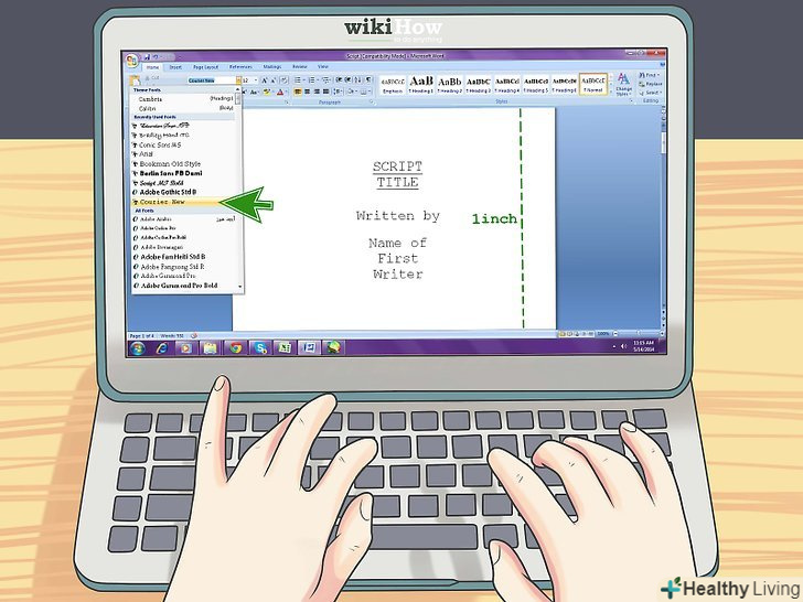 Використовуйте правильний шрифт, поля та інтервали. потрібно використовувати шрифт Courier (шрифт друкарської машинки), висотою 12 пунктів. Це надасть Вашому сценарію більш професійний вигляд і поліпшить читаність тесту. Також слід вибирати правильний відступ для різних частин сценарію, щоб діалоги, описи сцен тощо були відокремлені одна від одної.[1]