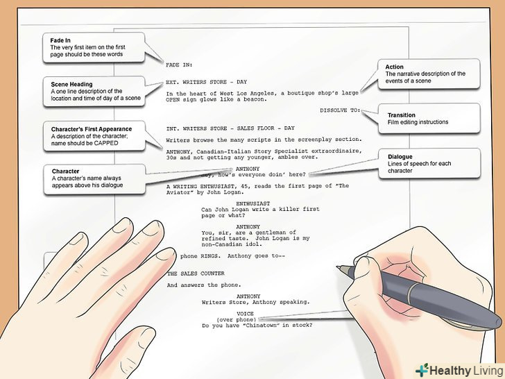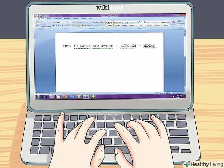 Пропишіть сюжет у форматі сценарію.точна форма буде відрізнятися в залежності від способу показу і навіть від географії. Кожна сцена повинна мати заголовок з описом, а перед кожною реплікою має бути ім'я вимовляє її героя і так далі. Продюсери можуть навіть не поглянути на сценарій, який не відповідає формату.- На цьому етапі роботи подумайте про придбання програми для написання сценаріїв. Таких програм кілька, і вони допоможуть вам надати тексту потрібний вид.