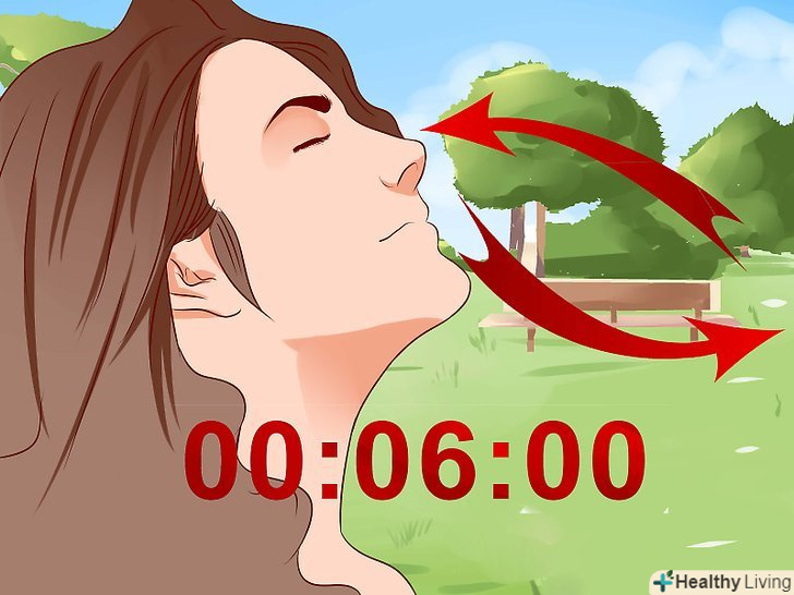 Використовуйте дихальні техніки.люди з соціальною тривожністю часто опиняються в таких ситуаціях, коли людину охоплює паніка і йому стає важко дихати. У таких випадках найкраще зосередитися на диханні, щоб заспокоїтися і взяти контроль над ситуацією в свої руки.[7]- Глибоко вдихайте через ніс протягом шести секунд. Відчуйте, як повітря проходить через грудну клітку і опускається в живіт.