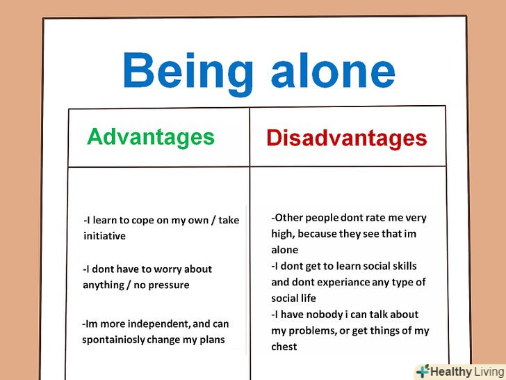 - Чим більше часу на самоті ви проведете, тим більший рівень тривожності ви відчуєте. Але навмисно піддаючи себе страху, ви будете готові до тривожності, яка незабаром розсіється. М'яко розсовуйте кордону, поки вам не стане комфортно від тієї кількості часу, який ви вже можете проводити на самоті. Уявіть, що ви хочете поплавати; можна, звичайно, занурити пальці ніг у воду, але так ви не зможете звикнути до температури води.[9]