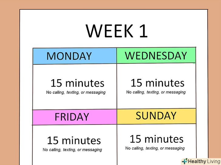 Поставте конкретні цілі.[6] наприклад, ви можете вирішити для себе, що проведетеп'ятнадцять хвилин наодинці з собою і не будетеписати або дзвонити кому б то не було . Цю вправу можна проробляти 4 рази в тиждень.- Просувайтеся поступово і приймайте до уваги те, наскільки сильний ваш страх. Все це потребує часу, і краще буде не поспішати. Сплануйте короткі періоди самотності. Потроху збільшуйте час самотності, поки не перестанете панікувати.