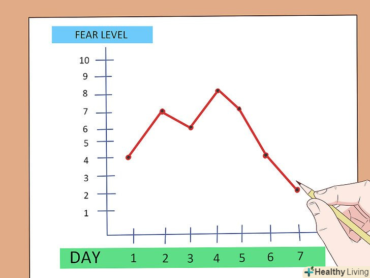 Записуйте прогрес у щоденник.під час і після періодів занурення в страх, відзначайте рівень свого страху за шкалою від 0 до 10, де 0 – це повністю розслаблений стан, а 10 – це найбільший рівень страху, який тільки можна уявити. Цей процес зможе показати вам, наскільки ви зменшили свою сприйнятливість до стану самотності, і який рівень страху ви вже спокійно можете долати.- Помічайте тенденції в процесі занурення в страх, коли рівень тривожності стає особливо високим або низьким. Чи бачите ви інші фактори, які впливають на ваш страх, наприклад, погода або те, з ким ви проводили час перед цим?