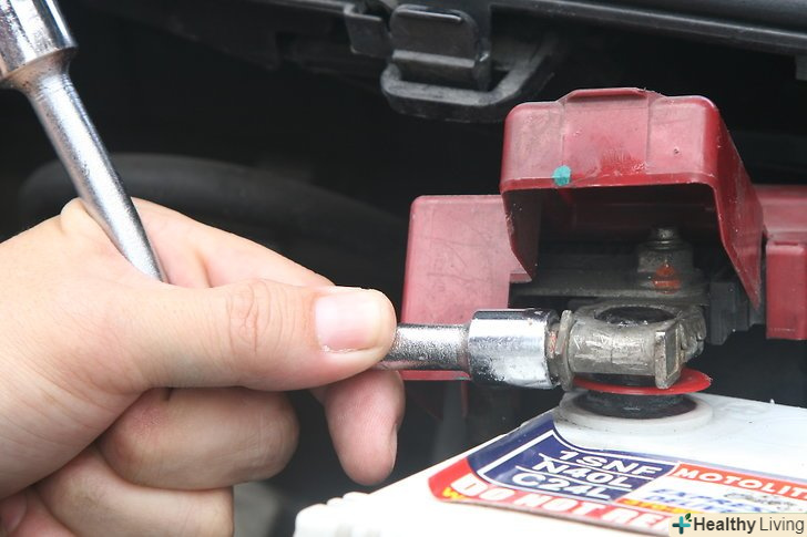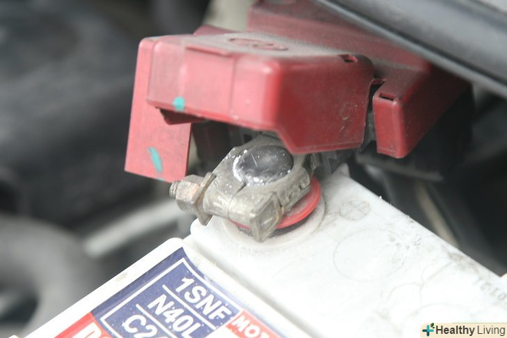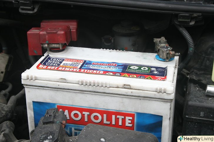 Від'єднайте акумуляторну батарею.перед початком вам буде потрібно від'єднати батарею. Для цього послабте муфти на клемах за допомогою гайкового ключа. Після цього від'єднайте клему, позначену знаком" -". Порядок дій дуже важливий. Тільки після від'єднання клеми зі знаком "-" Ви можете від'єднувати клему зі знаком "+" [1].- Від'єднання клем може виявитися непростим завданням, особливо при великій кількості корозійного нальоту. Вам можуть знадобитися Пасатижі. Будьте обережні і не торкайтеся металевими інструментами до каркасу машини (або до будь-яких інших металевих деталей) і батареї під час роботи. Це може привести до замикання батареї.