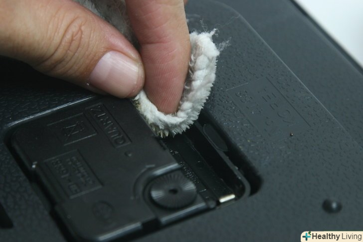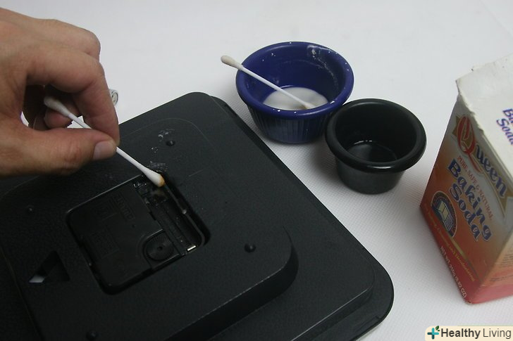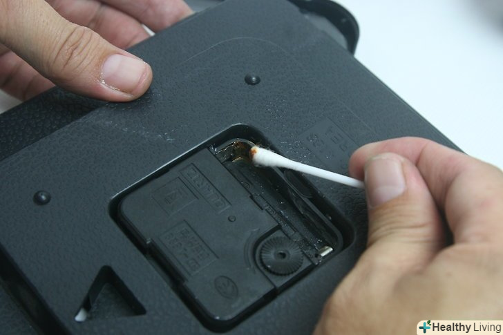 Очищення за допомогою води.використовуйте зволожений шматок м'якої тканини або ватяні палички для видалення основної частини корозійного нальоту. Попередньо надіньте гумові рукавички (для миття посуду).- Якщо вам пощастить, то відсік з контактами вийде витягти цілком. В такому випадку ви зможете замочити весь корпус в ємності, заповненої сумішшю води і харчової соди. Але в більшості випадків вам не вдасться витягти все цілком, так що доведеться справлятися з корозією, усуваючи її ватяними паличками.