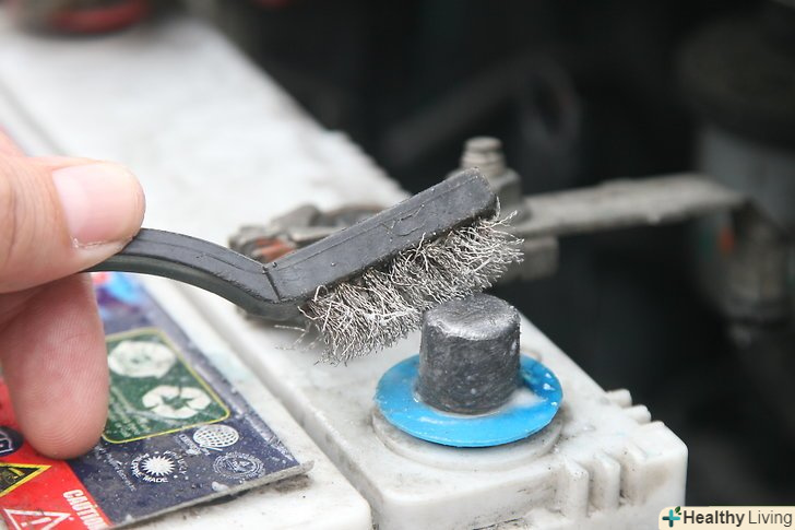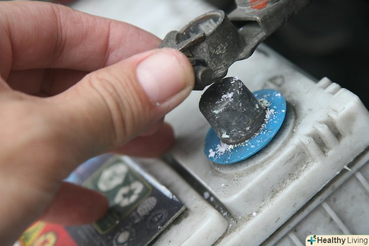 Оцініть ступінь корозії.зніміть пластикове або гумове покриття з верхньої частини батареї. Ви отримаєте доступ до майданчика з клемами. Огляньте кабелі і клеми на предмет зносу і корозії. Корозія виглядає як попелясто-білий наліт на одному або обох штирях батареї. Якщо пошкодження занадто серйозні, то вам може знадобитися повністю замінити кабелі і клеми, щоб уникнути подальших проблем в майбутньому. Якщо ж кабелі і клеми знаходяться в прийнятному стані і присутній тільки незначний наліт, тоді дотримуйтесь подальших інструкцій і проведіть чистку.