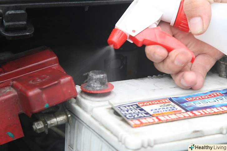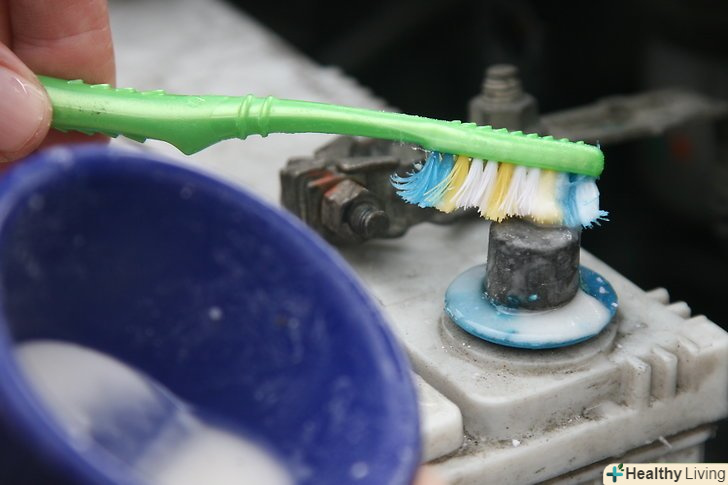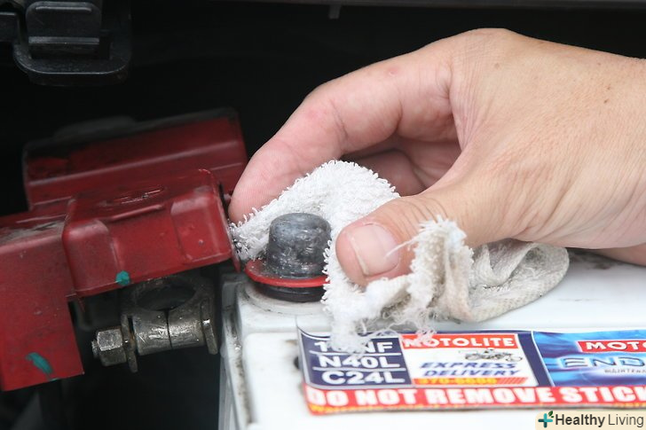Промийте контакти.після того, як паста перестане пінитися, і ви видалите основну частину нальоту, вам буде потрібно промити контакти батареї. Використовуйте для цього невелику кількість води. Намагайтеся, щоб содова паста не потрапила всередину батареї, так як сода може нейтралізувати кислоту всередині батареї і тим самим скоротити термін її служби.