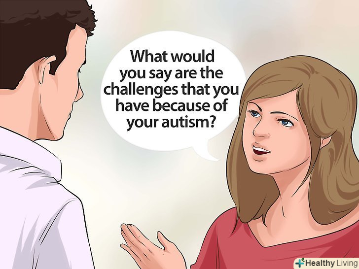 Дізнайтеся потреби хлопця.оскільки всі аутисти різні, то і ваш хлопець може відчувати складнощі, які не характерні іншим аутистам. Задавайте питання, щоб краще зрозуміти його проблеми і переваги. Так ви зможете приділяти більше уваги його потребам.[7]- Наприклад, скажіть наступне: "Я хочу більше дізнатися про аспекти, які представляють для тебе складності, щоб стати уважніше. З якими складнощами тобі доводиться мати справу?”.