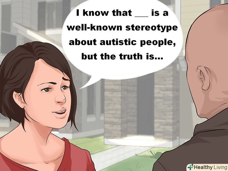 Забудьте про стереотипи.існує безліч стереотипів щодо аутизму на кшталт того, що аутисти не здатні любити або проявляти емоції. Це не так. Вони відчувають безліч емоцій, але висловлюють їх інакше.[12]- Займіть сторону аутистів і вказуйте на невірні припущення про них. Це можна виразити наступним чином: "я знаю, що _ _ – - це поширений стереотип про аутистів, але правда в тому, що...".