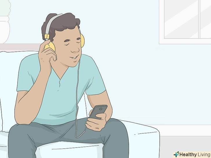 Спробуйте розслабитися за допомогою музичної терапії.складіть список заспокійливих композицій, які підвищують вам настрій. Якщо або коли відчуєте наближення тривожності, включіть цю музику, щоб розслабитися. По можливості використовуйте шумопоглинаючі навушники, щоб зосередитися на музиці. Концентруйтеся на різних партіях, на звуках, на тексті, якщо він є. Це допоможе вам відволіктися від страху.[17]