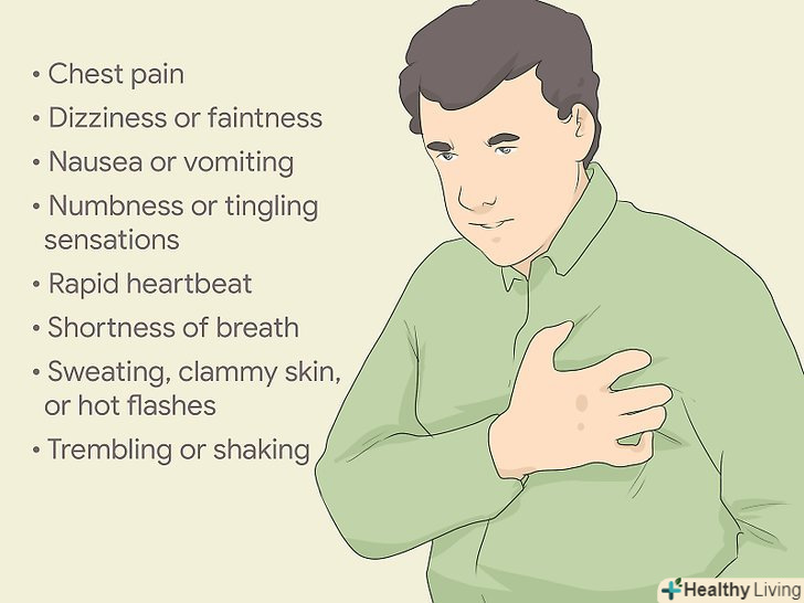 Проаналізуйте фізичні симптоми.панічні атаки можуть трапитися з кожним, але найчастіше вони спостерігаються у людей з панічним розладом - тривожним розладом, якому властиві часті напади страху і тривожності. Запустити реакцію може практично будь-яка ситуація, не тільки небезпечна. До фізичних симптомів панічної атаки відносяться наступні:[26]- Біль у грудях. Не бійтеся розповісти їм про свої проблеми, навіть якщо вам ніяково.