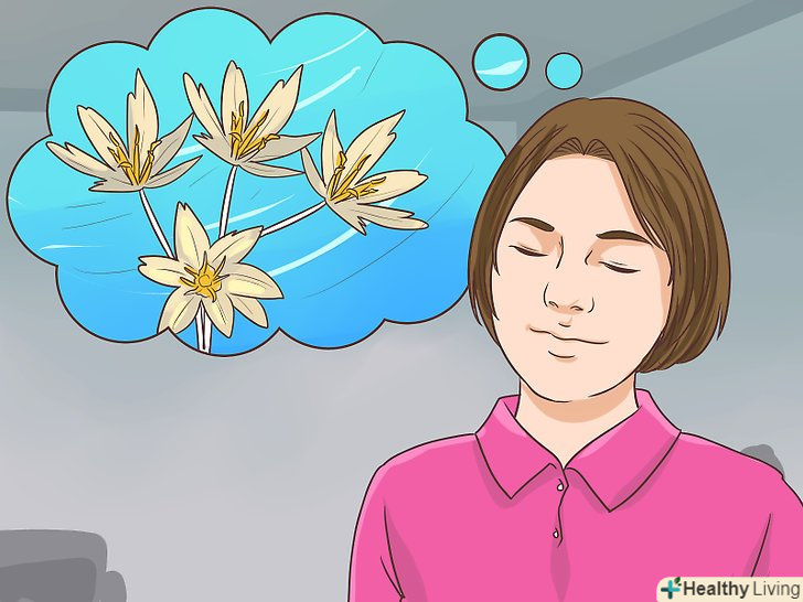 Наочно уявляйте заспокійливі сцени .якщо уявити собі спокійне місце, то ви досить швидко зможете взяти себе в руки. Уявіть свій улюблений куточок в деталях, включаючи зовнішній вигляд, звуки, запахи і навіть відчуття. Залишайтеся в цьому місці так довго, як потрібно.[8]- Наприклад, можна уявити, що ви знаходитесь на лузі влітку. Навколо вас цвітуть прекрасні польові квіти, трава і рослини виділяють солодкий аромат, повітря наповнене шелестом стебел, а теплі промені сонця м'яко пестять вашу шкіру.
