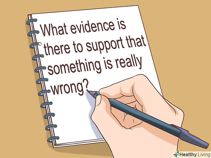 Задавайте собі питання, які поставлять почуття тривоги під сумнів.спробуйте скласти список об'єктивних питань, які допоможуть вам оскаржити причини для занепокоєння. Спроби знайти раціональне пояснення тривоги дозволять послабити її владу над вами. Задавайте собі такі питання:[14]- Які факти підтверджують причини для занепокоєння?