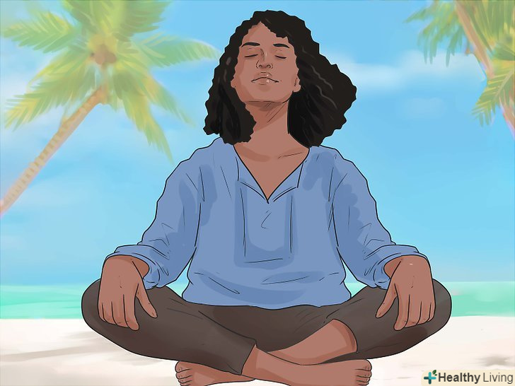 - Медитація-це техніка, яку можна з легкістю практикувати у себе вдома. Знайдіть зручне місце, де можна сісти зі схрещеними ногами, поклавши руки на коліна. Закрийте очі і глибоко дихайте. Якщо ваші думки почнуть розбрідатися, акуратно повертайте їх до концентрації на диханні. Спробуйте включити CD-диск або завантажити MP3-файли, щоб вони направляли вас під час медитації.[8]